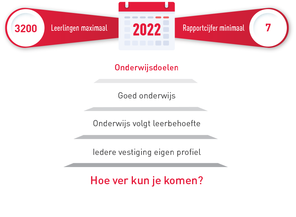Onze drie onderwijskundige doelen ‘duurzaam goede resultaten’, ‘onderwijs afgestemd op leer- en ondersteuningsbehoefte van leerlingen’ en ‘context van de vestiging medebepalend voor onderwijsontwikkeling’ vormen met elkaar één geheel die in de praktijk vanzelfsprekend met elkaar samenhangen.